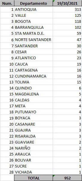 Mapa de Colombia de casos acumulados de Covid-19- 19 octubre 2021