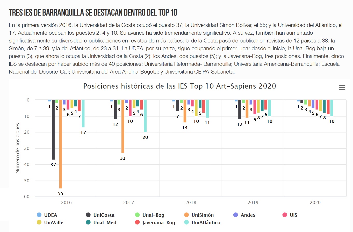 De acuerdo con el Ranking ART-Sapiens 2020 realizado por Sapiens Research, la Universidad de la Costa ocupó el segundo lugar dentro del top 10 de las mejores instituciones de educación superior colombianas según posicionamiento de artículos científicos.