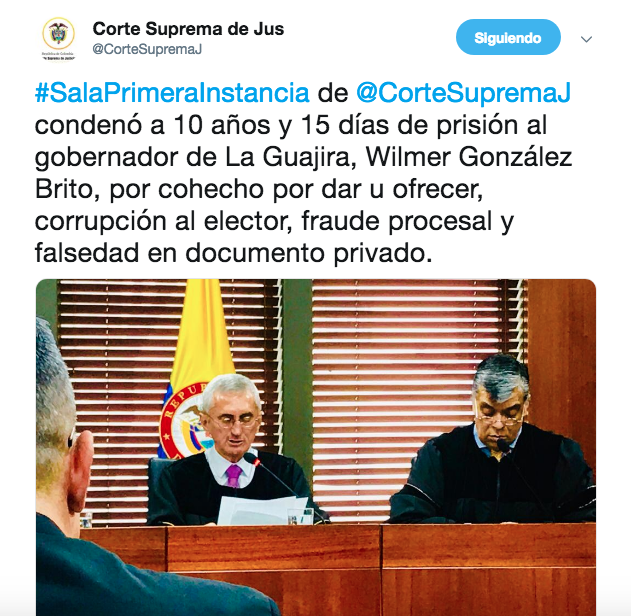 "Sala de Primera Instancia de @CorteSupremaJ condenó a 10 años y 15 días de prisión al gobernador de La Guajira, Wilmer González Brito, por cohecho por dar u ofrecer, corrupción al elector, fraude procesal y falsedad en documento privado", informó la Corte en su cuenta de Twitter.