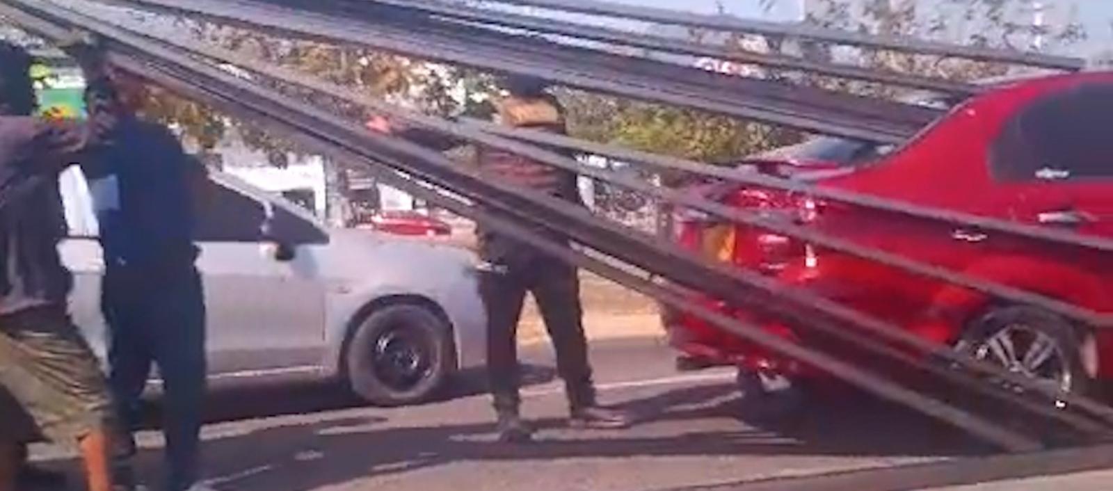 En un video que circula en redes sociales quedó evidenciado cómo unas varillas transportadas en un camión quedaron incrustadas en un vehículo particular rojo que iba adelante.
