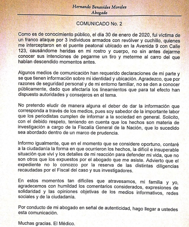 El reconocido médico que asesinó a tres delincuentes en un peatonal, en Bogotá, rompió su silencio este viernes, a través de un comunicado divulgado por su abogado.
