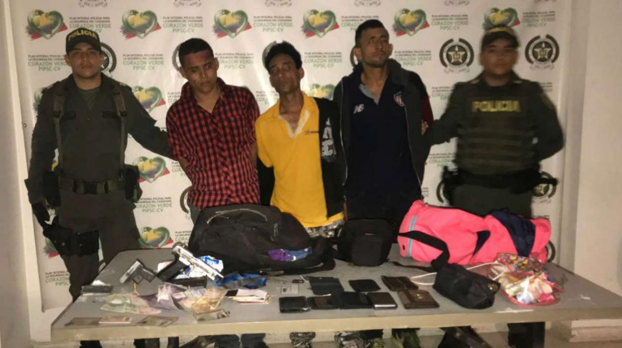 En la vía que conduce al corregimiento de Caracolí, la Policía capturó anoche a Gustavo Adolfo Villanueva Llerena, de 29 años, de Calamar (Bolívar); Héctor Junior Cantillo Fritz, de 30 años, natural de Barranquilla; y a Jorge Armando Jiménez Padilla, de 30, oriundo de Mompox, a quienes les incautaron dos armas de fuego artesanal y elementos que presuntamente hurtaron a los pasajeros de un bus interdepartamental que cubría la ruta Riohacha-Barranquilla-Cartagena.