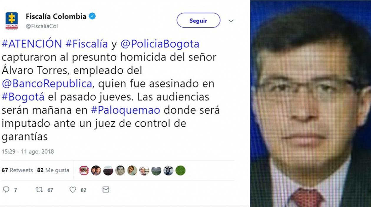"Fiscalía y Policía de Bogotá capturaron al presunto homicida del señor Álvaro Torres, empleado del Banco de la República, quien fue asesinado en Bogotá el pasado jueves. Las audiencias serán mañana en Paloquemao, donde será imputado ante un juez de control de garantías", detalló el ente acusador en un comunicado.