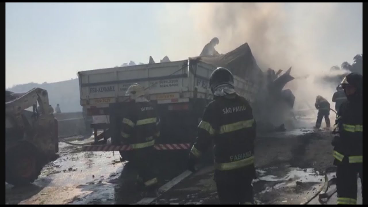 De acuerdo con la Policía Regional de Carreteras, el accidente fue provocado por un camión que transportaba pinturas y que embistió a otro que cargaba metales en un viaducto que comunica la capital con los municipios del interior del Sao Paulo.