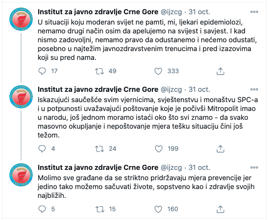 El Instituto de Salud Pública de Montenegro @ijzcg, tras la muerte del arzobispo Amfilojiie (Radović), arzobispo de Cetinje, metropolita de Montenegro y el Litoral, escribió el 31 de octubre, una serie de trinos, en medio del mayor respeto religioso: "En una situación que el mundo moderno no recuerda, los epidemiólogos no tenemos más remedio que apelar a la conciencia y la conciencia. Y cuando no estamos satisfechos, no tenemos derecho a darnos por vencidos y no nos daremos por vencidos, especialmente en los momentos más difíciles de salud pública y ante los retos que nos esperan".