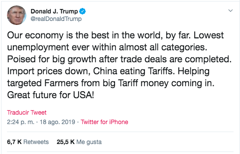 "Nuestra economía es la mejor del mundo, con diferencia", escribió Trump en su cuenta de Twitter, en la exhibió como un logro de su Administración el bajo desempleo en casi todas las categorías.