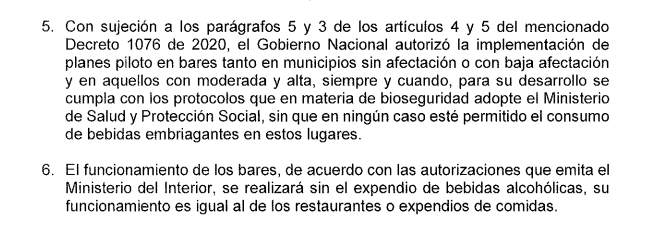 De manera conjunta, el Ministerio de Salud, Ministerio del Interior y Ministerio de Comercio, Industria y Turismo expidieron la circular conjunta externa “Por la cual se imparten instrucciones para la apertura de bares en las condiciones establecidas en el Decreto 1076 de 2020”.