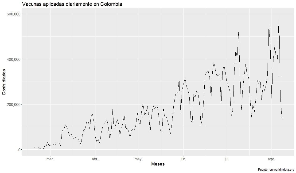 Esto se evidencia al analizar la serie de tiempo de las dosis de vacunas aplicadas diariamente en Colombia. Aunque existe una clara tendencia al alza a lo largo del tiempo, la varianza también se incrementa con el pasar de los días, así como hay picos cada vez más altos, las caídas también son cada vez más pronunciadas. No hay duda de que algunas de estas caídas pueden atribuirse al mismo Gobierno, que no ha sido capaz de asegurar un suministro constante de dosis a la población en general, sin embargo, con el pasar de los días la escasez de vacunas se ha ido haciendo cada vez menor.