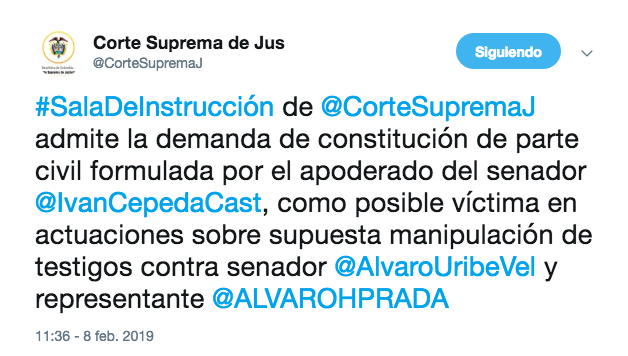 "La Sala de Instrucción de la Corte Suprema de Justicia admite la demanda de constitución de parte civil formulada por el apoderado del senador Iván Cepeda, como posible víctima en actuaciones sobre supuesta manipulación de testigos contra senador Álvaro Uribe y representante Álvaro Hernán Prada", informó el alto tribunal en su cuenta de Twitter.