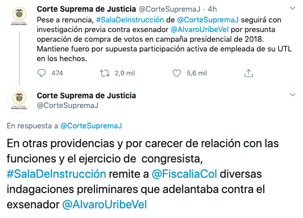 "Pese a renuncia, Sala de Instrucción de Corte Suprema de Justicia seguirá con investigación previa contra exsenador Álvaro Uribe Vélez por presunta operación de compra de votos en campaña presidencial de 2018", indicó.