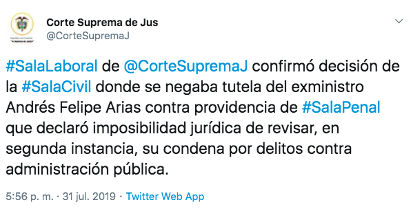 "La Sala Laboral de la Corte Suprema de Justicia confirmó decisión de la Sala Civil donde se negaba tutela del exministro Andrés Felipe Arias contra providencia de Sala Penal que declaró imposibilidad jurídica de revisar, en segunda instancia, su condena por delitos contra administración pública".