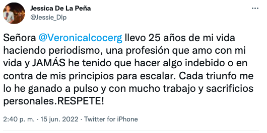 De La Peña, por su parte, afirmó: "Señora Verónica Alcocer llevo 25 años de mi vida haciendo periodismo, una profesión que amo con mi vida y JAMÁS he tenido que hacer algo indebido o en contra de mis principios para escalar".