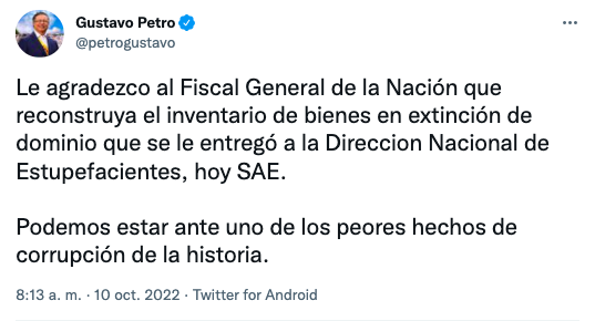 "Le agradezco al Fiscal General de la Nación que reconstruya el inventario de bienes en extinción de dominio que se le entregó a la Dirección Nacional de Estupefacientes, hoy SAE", indicó.