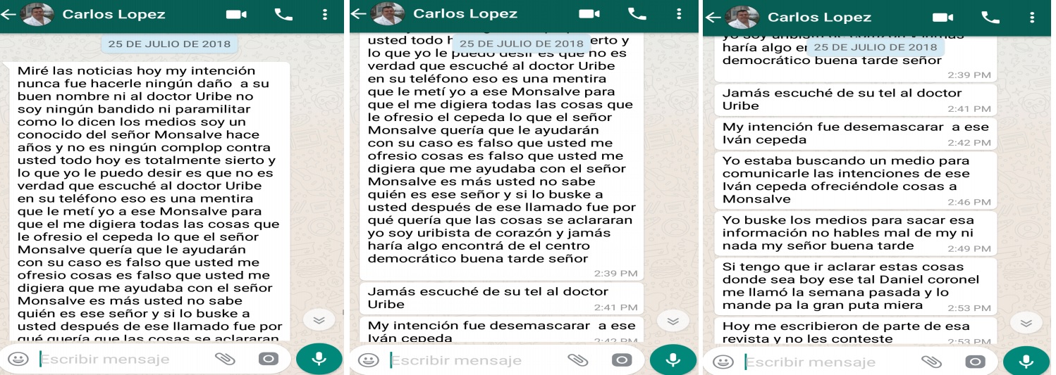 Prada dijo: "yo he venido aquí a demostrar que yo no he cometido ningún delito". E hizo referencia a los chats que, a través de WhatsApp, demuestran que el señor Monsalve a través del señor Carlos López.