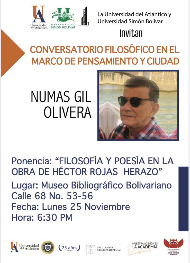 Este lunes 25 de noviembre, el profesor Numas Gil Olivera dictará su charla ‘Filosofía y poesía en la obra de Héctor Rojas Herazo’, en el Museo Bibliográfico Bolivariano (calle 68 # 53-56).