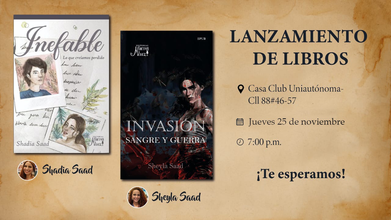 Las escritoras Shadia y Sheyla Saad presentarán sus novelas “Inefable” e “Invasión: sangre y guerra” editadas por la Editorial Nueva Luz este jueves 25 a las 7 de la noche en la Casa de Eventos de la Uniautónoma después de hacer semanas antes el lanzamiento oficial en la Feria del Libro de Pereira.